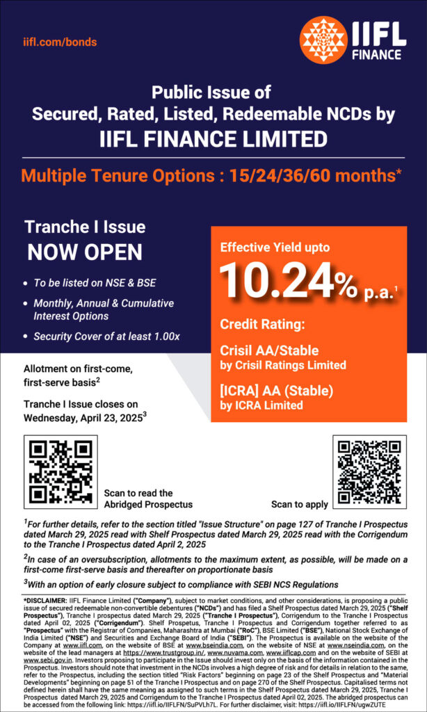 The NCDs are rated “Crisil AA/Stable” by Crisil Ratings Limited and “[ICRA] AA (Stable)” by ICRA Limited. The debentures with these ratings areconsidered to have high degree of safety regarding timely servicing of financial obligations. Suchdebentures carry very low credit risk. The issue opens on Monday, April 7, 2025 and closes on Wednesday, April 23, 2025.